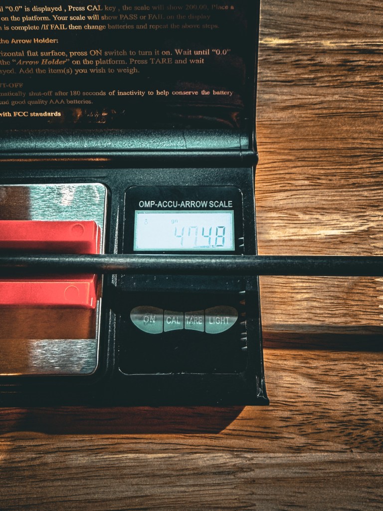Final arrow weight: 474.8 grains, verified on an arrow scale.