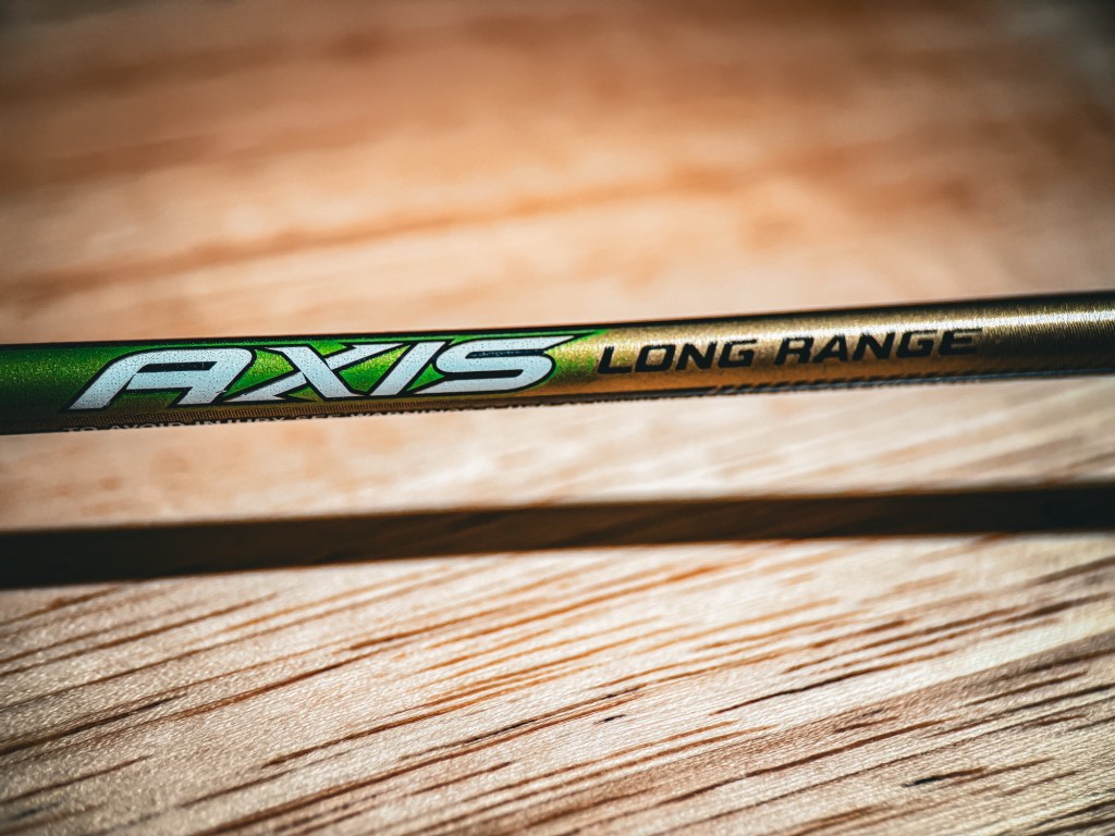 The foundation of the system: Easton 4mm Long Range Axis, 300 spine. Smaller diameter, better wind behavior, zero gimmicks.